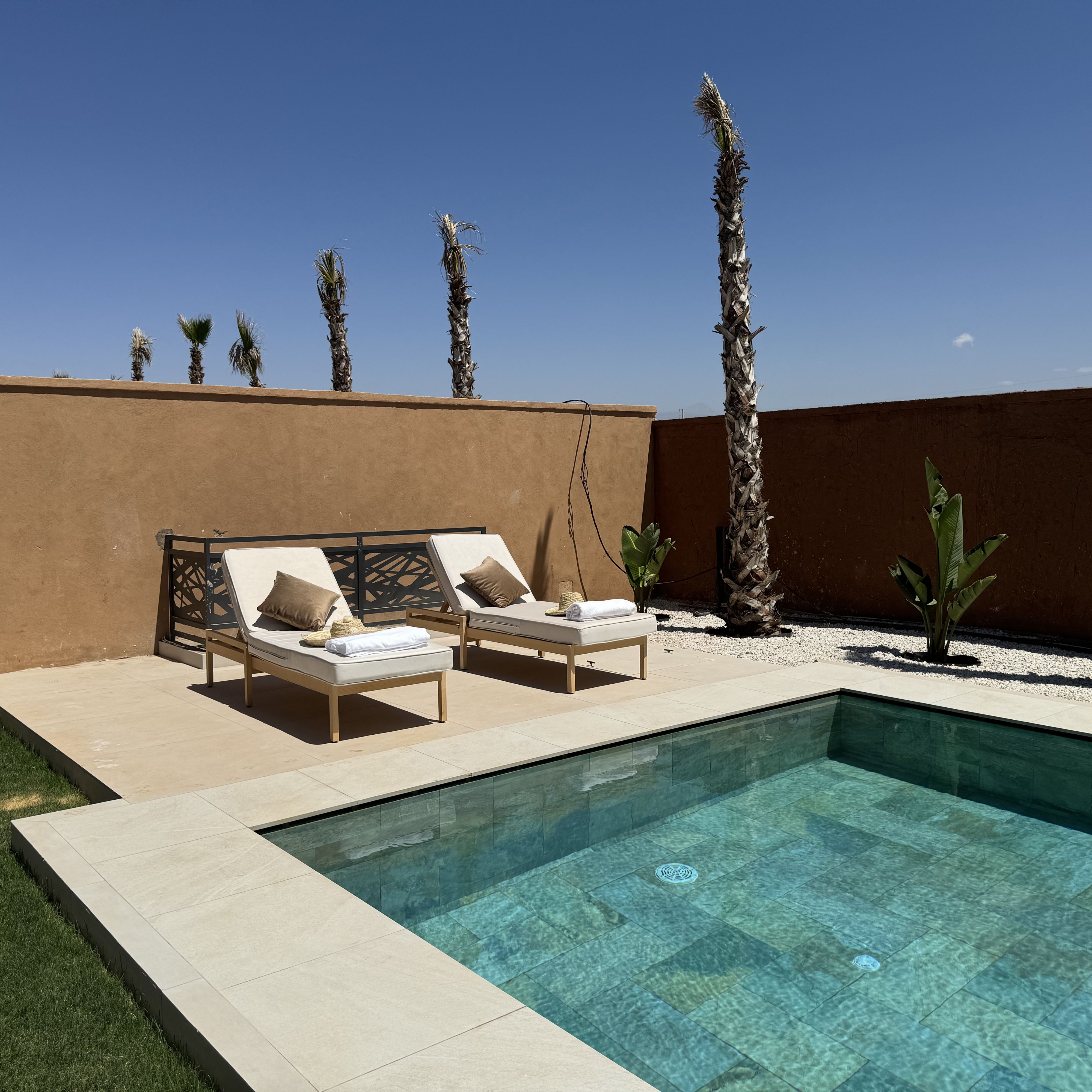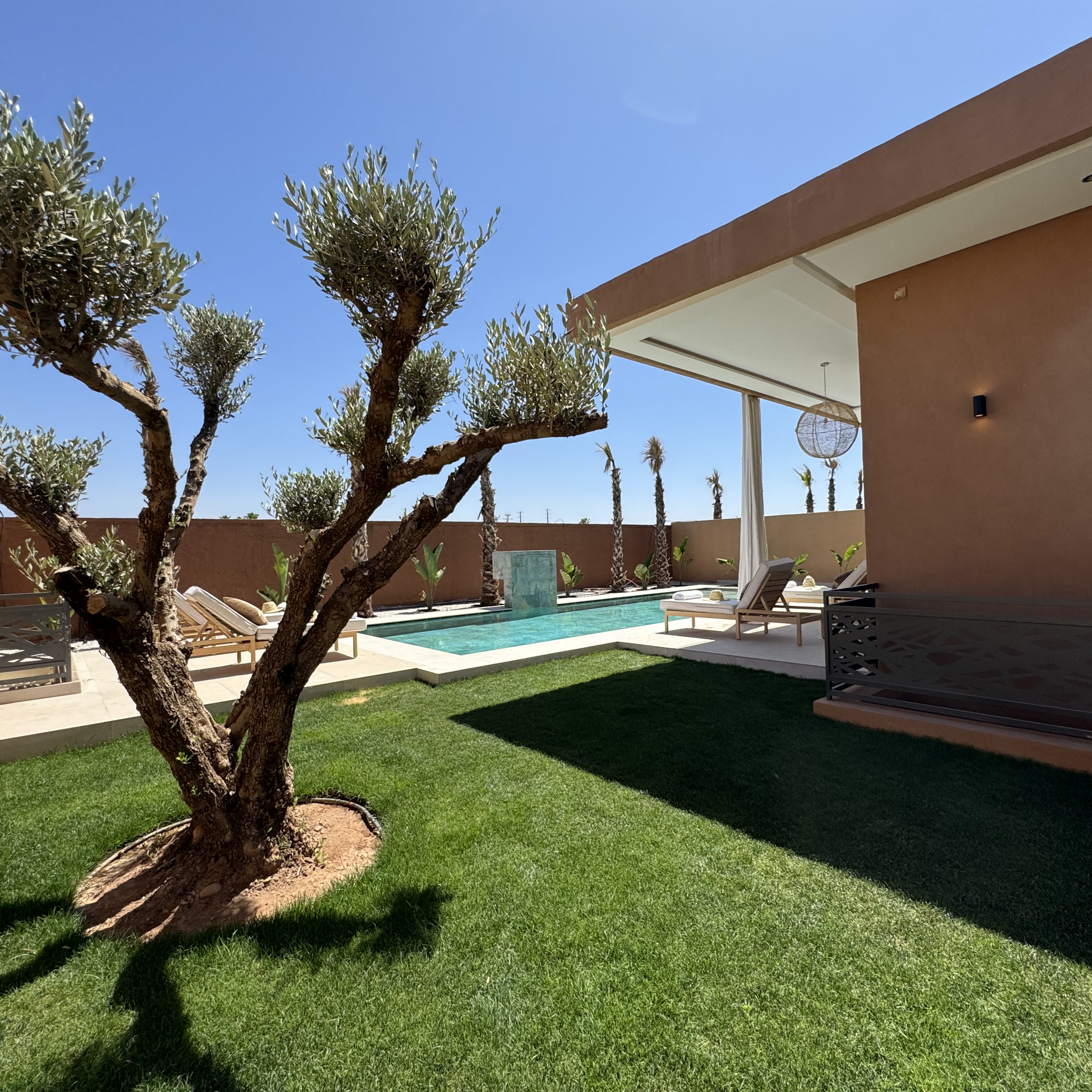 Profitez d’une grande piscine sans aucun vis-à-vis, parfaite pour se relaxer sous le soleil marocain. Vous pourrez également demander son chauffage, pour un bien-être maximal à tout moment de l’année. Depuis le jardin, laissez-vous envoûter par une vue dégagée sur les montagnes de l’Atlas, un décor naturel absolument unique.