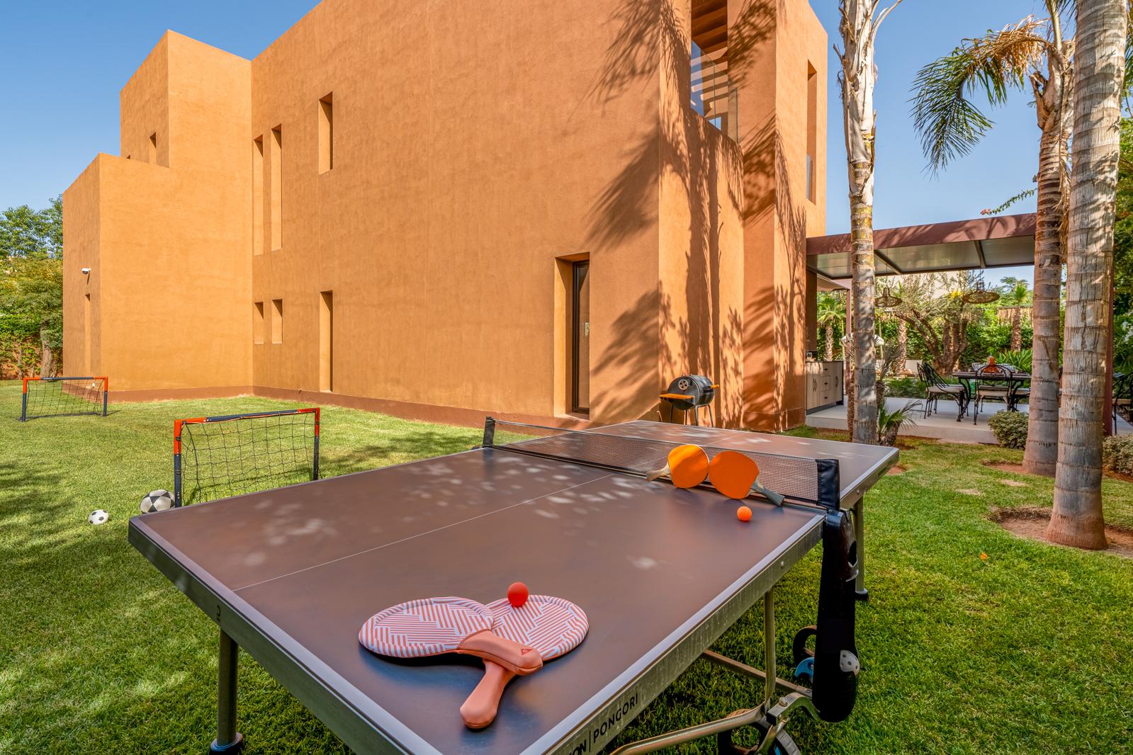 Les espaces de vie sont spacieux et lumineux, avec un séjour d’exception qui invite à la détente et à la convivialité. À l’extérieur, un jardin paysager entoure une piscine en pierre de Bali, créant une atmosphère apaisante et raffinée. Pour les loisirs, la villa propose une table de ping-pong et un petit terrain de football, parfaits pour des moments de plaisir en famille ou entre amis.