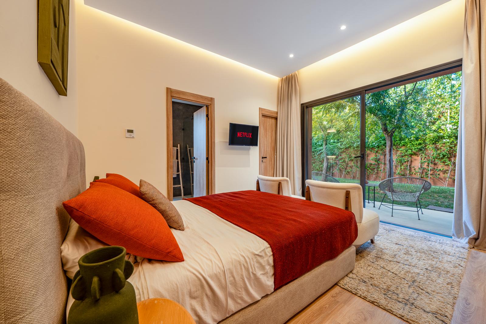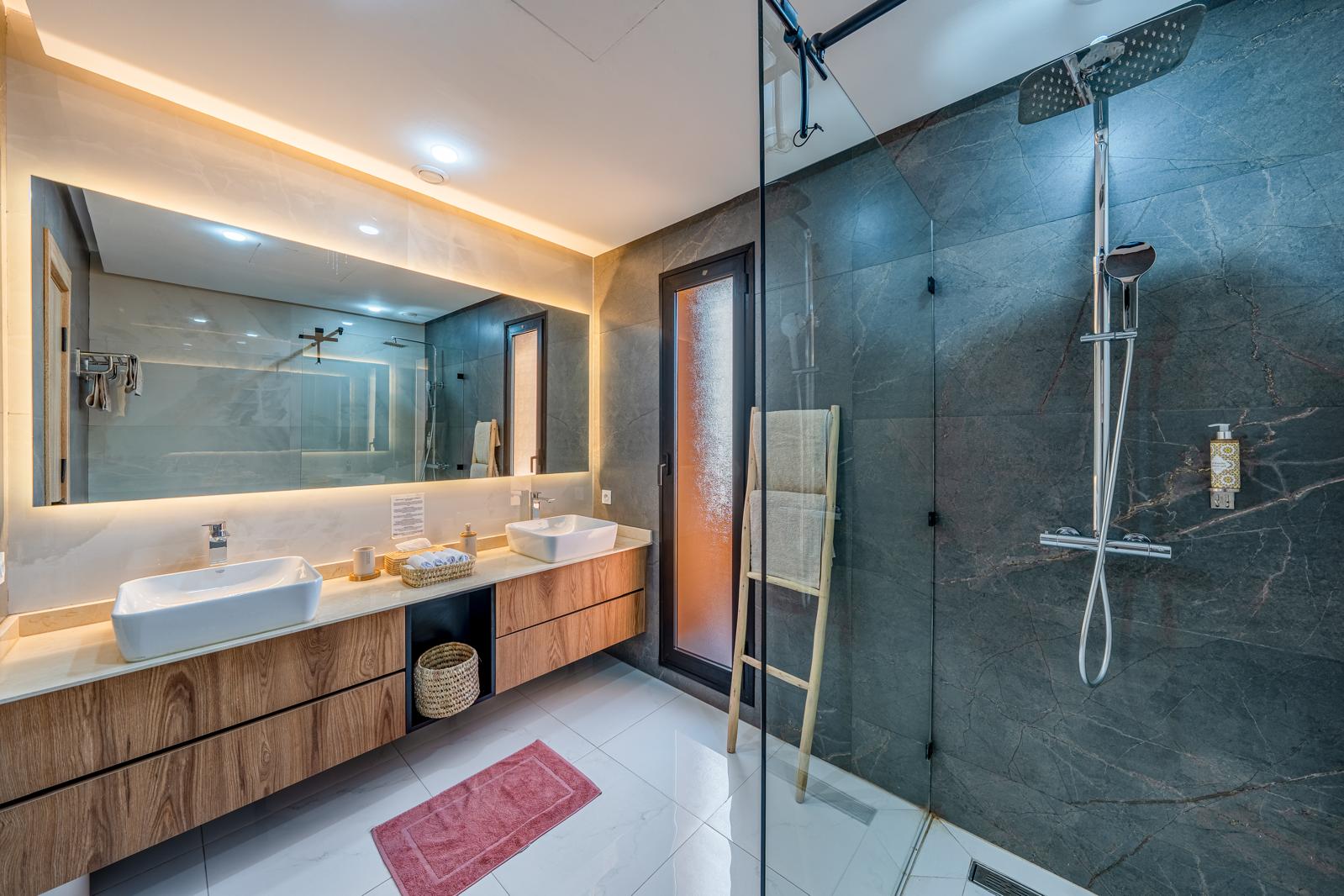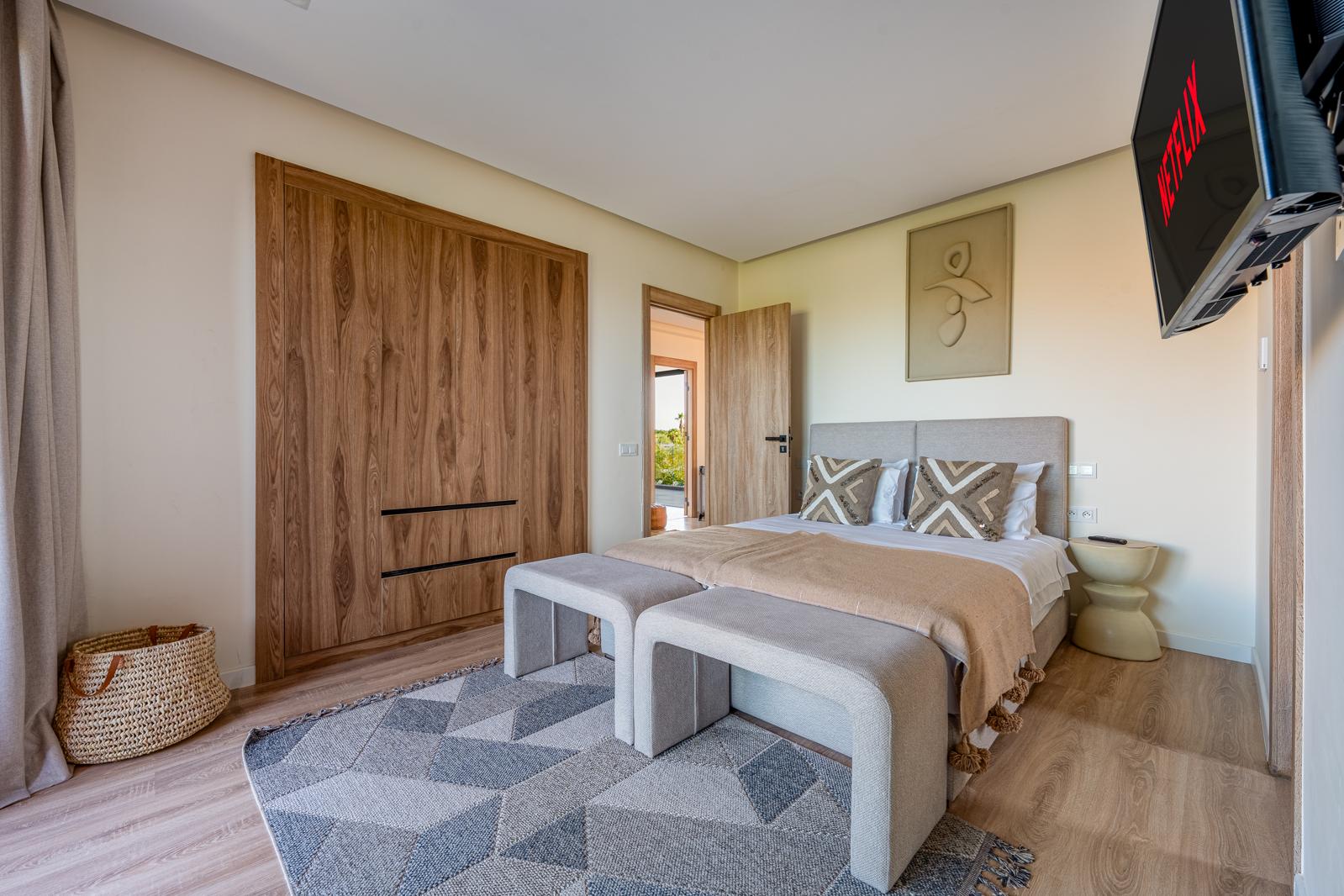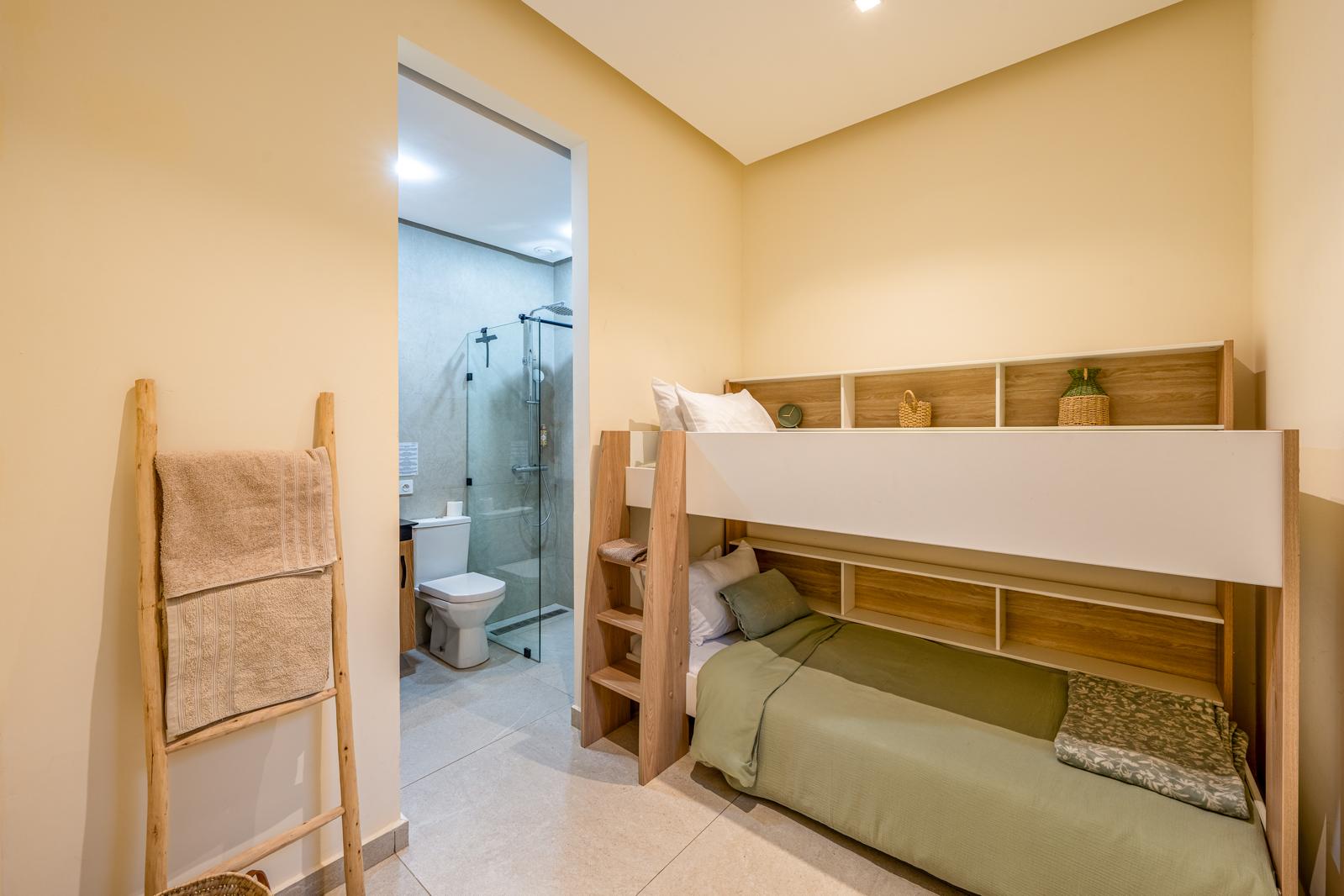 La villa dispose de cinq suites élégantes, dont une conçue spécialement pour les enfants, équipée de lits superposés. Chaque suite bénéficie de sa propre salle de bain privative, garantissant intimité et bien-être à tous les invités.