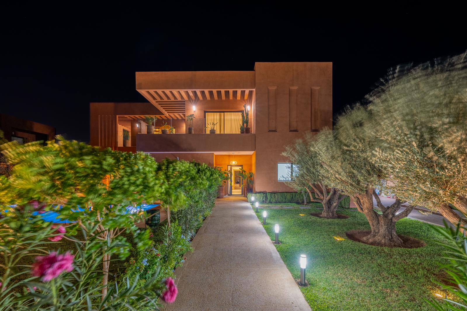 La villa Eva est une superbe demeure contemporaine, idéale pour des séjours d’exception à Marrakech. Nichée sur une parcelle de 1200 m2 et offrant 350 m2 de surface habitable, cette villa allie modernité et charme de l’artisanat marocain. Située à proximité des golfs les plus prestigieux et à seulement 15 minutes du centre-ville, elle offre un cadre unique, mêlant luxe, confort et authenticité.
