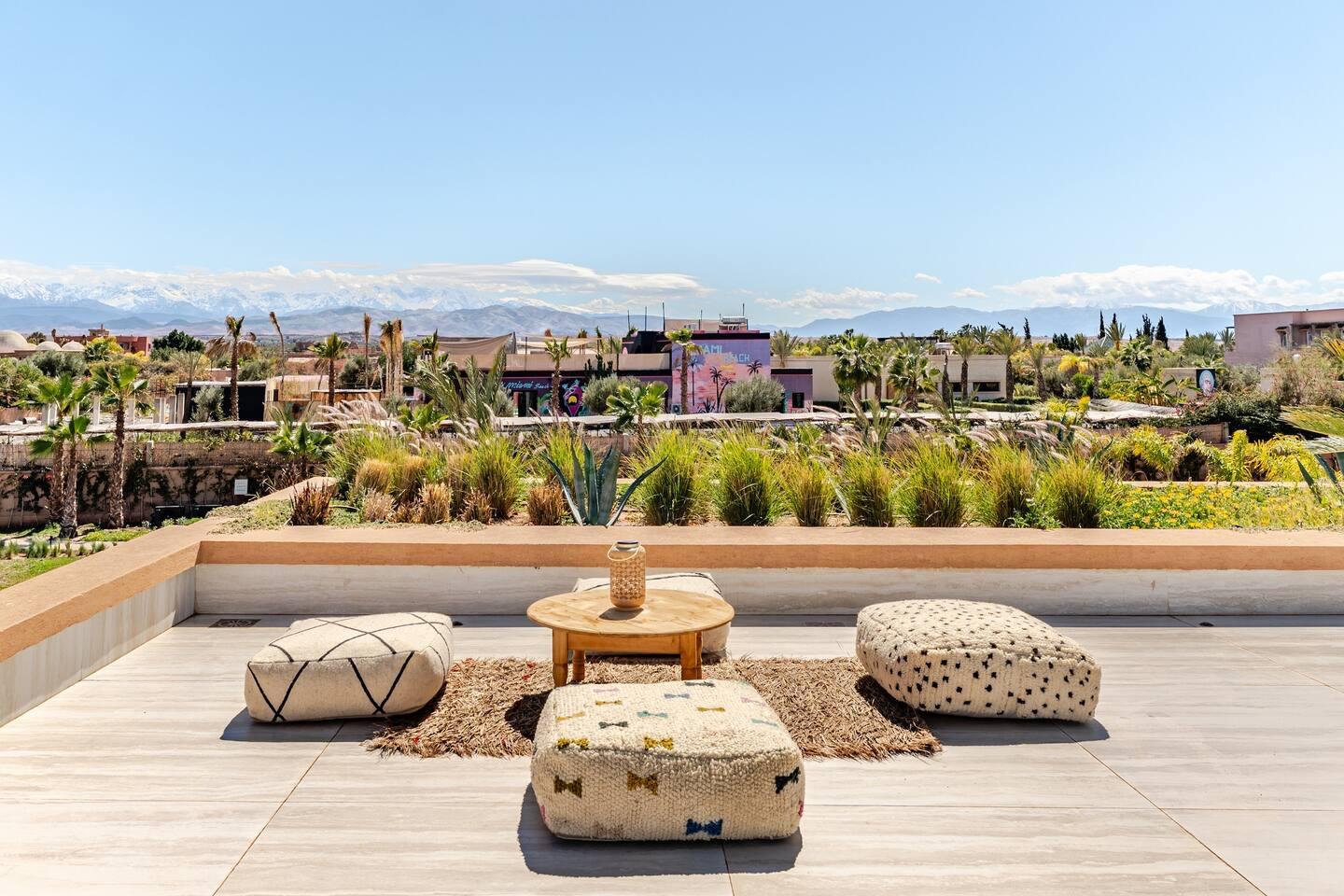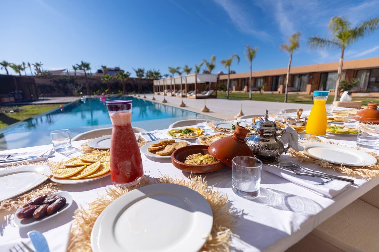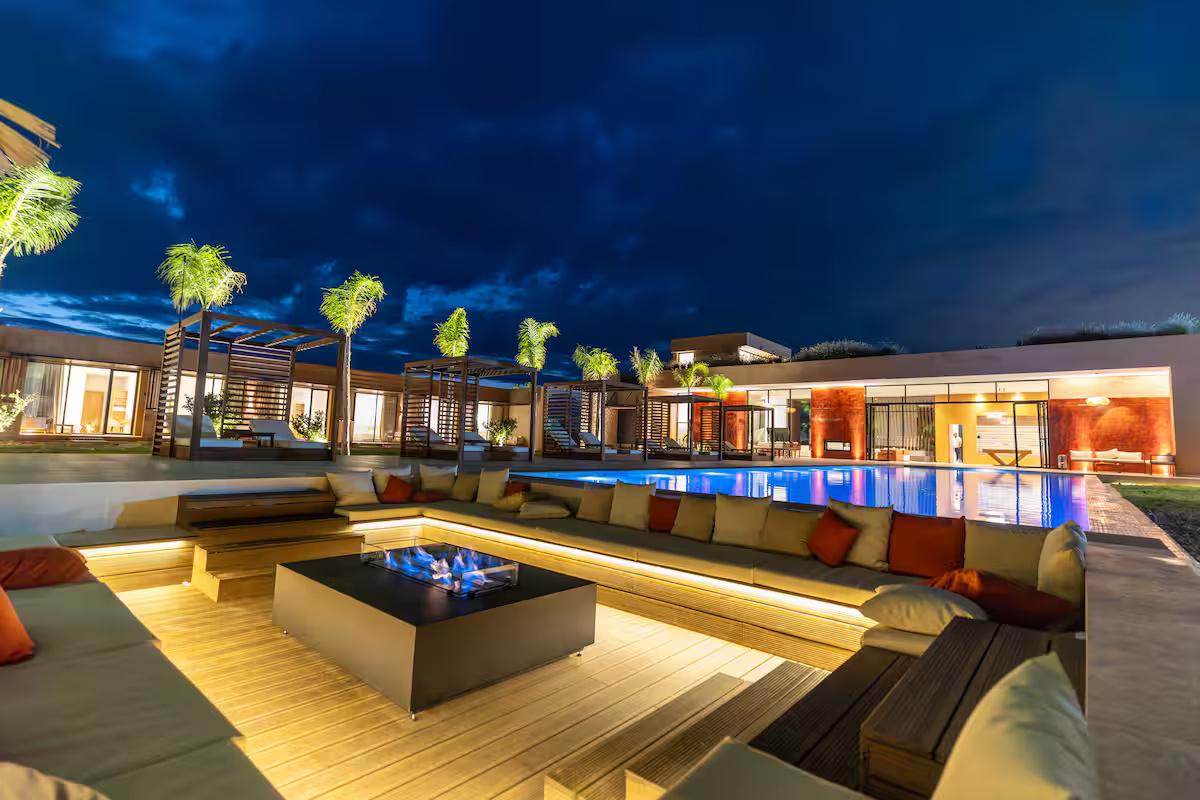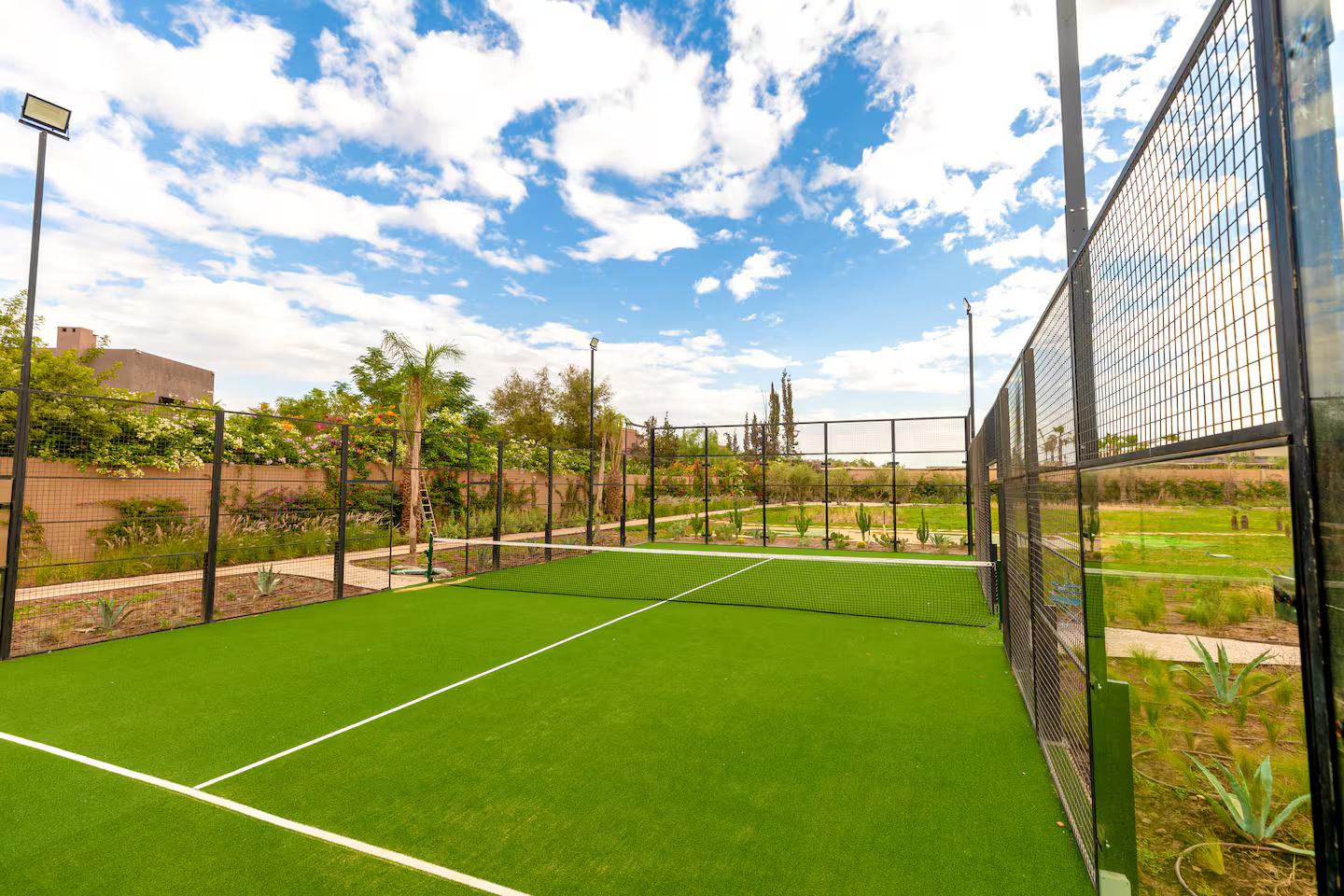 Au cœur du domaine, une piscine spectaculaire évoque les plus beaux resorts. Entourée d’un jardin luxuriant, elle invite autant au farniente qu’aux moments de convivialité sous le soleil marocain. Pour les voyageurs actifs, la villa offre le privilège rare de disposer d’un court de padel et de pickleball privés, parfaits pour des sessions sportives exclusives dans un décor magnifique.